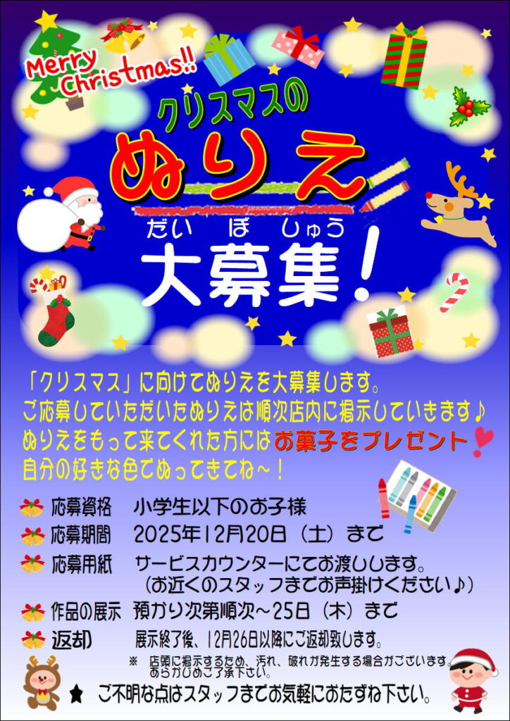 笠原店限定!クリスマスのぬり絵大募集中!!