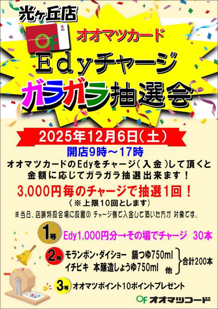 12月6日(土)開店9時~17時までにオオマツカードのEdyをチャージして頂くとガラガラ抽選出来ます!(※当日、光ヶ丘店特設会場のチャージ機でご入金された方が対象です)